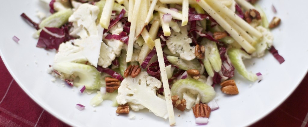 SALAD: 1/4 head of a 1 lb. raw cauliflower, sliced thin 1/4 head romaine, shaved 2 stalks celery, sliced thin 1/2 apple, cut into matchsticks 1/4 c. pecans, coarsely chopped 2 T red onion, minced DRESSING: 2 tsp. Dijon mustard 1 tsp. honey 1/4 c. walnut oil salt & pepper DIRECTIONS: Make the dressing first by […]