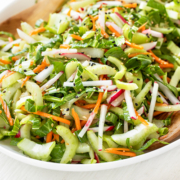 To a large bowl, add the thinly-sliced baby bok choy, along with the carrots and radishes, and keep cold in the fridge while you prep the vinaigrette.