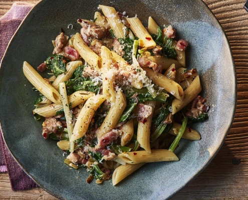 Pasta with Chicken Sausage, Leeks, Corn, and Crimini Mushrooms